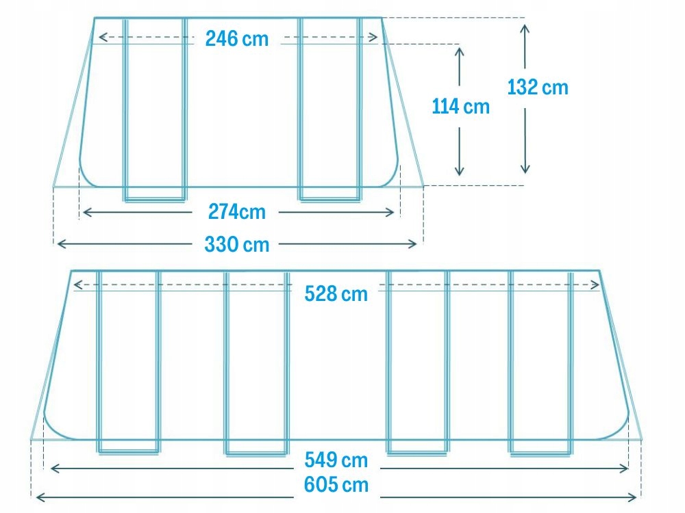 1. FRAME POOL - Басейн Ultra XTR Rectangular Frame від Intex, розмір 549 см x 274 см x 132 см - місткість 17 203 л. Виробник вказує, що він наповнений водою на максимальному рівні 90%. Час складання займає приблизно 60 хвилин.