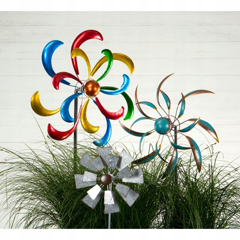 Різнобарвний метал додає вітряку радості, а його мерехтливі кольори оживляють простір саду.
