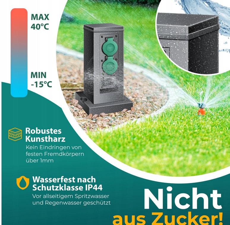 енергії у вашому саду Кессера! Ви можете вільно розміщувати прикраси з електричним харчуванням у саду або насолоджуватися відпочинком за допомогою улюбленої музики, зарядити телефон та використовувати інші пристрої. Колонка постачання Kesser пропонує безліч можливостей організувати простір у вашому саду ще краще. Він витримує температуру від -15 ° C до +40 ° C, і завдяки матеріалу, виготовленому з тепловідповідачів штучної смоли, також захищено від УФ -випромінювання. Пристрій можна керувати вручну за допомогою перемикача або встановлення для автоматичного вмикання в сутінках, що буде ідеально підходить для освітлення вночі. функція гнізда. За допомогою прикріпленої колу ви можете легко засунути гніздо в землю або встановити його на стіну, використовуючи прикріплені гвинти та кілочки. Кемпінгова розетка відповідає всім очікуванням.