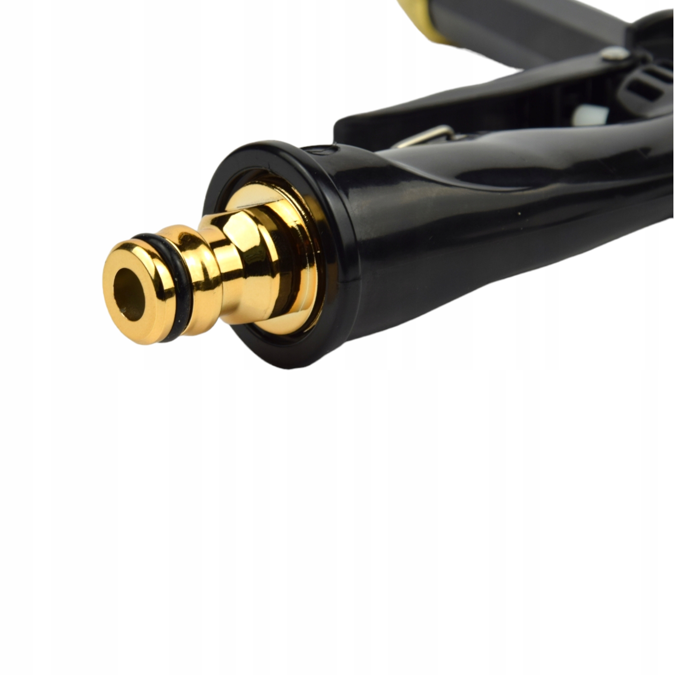 Садовий пістолет з регульованим потоком води від сильного до слабкого туману. Крім того, пістолет має фіксатор спускового гачка для більшої зручності.