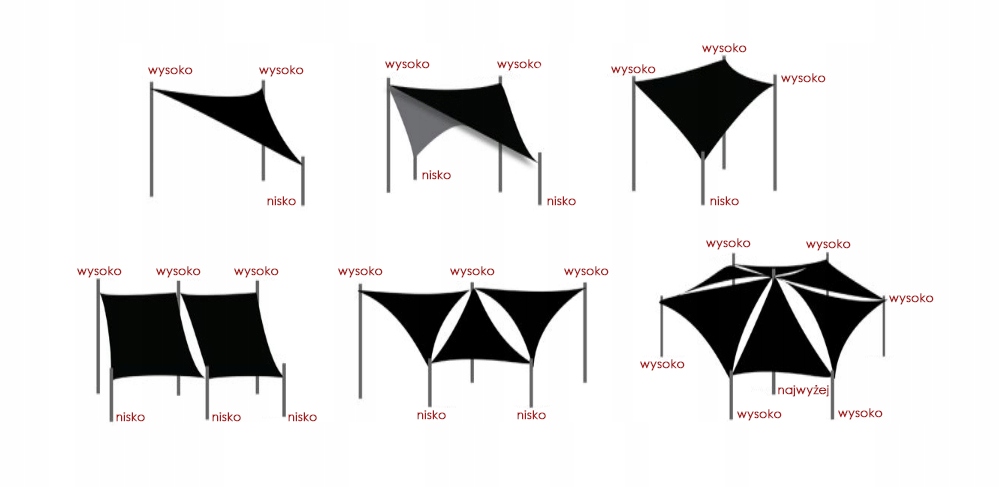 При складанні пам'ятайте, що кожне вітрило вимагає запасу натягу. Це слід враховувати при плануванні монтажу, а відстань між точками кріплення має бути невеликою. Не забувайте регулярно натягувати вітрила, щоб матеріал був натягнутим.
