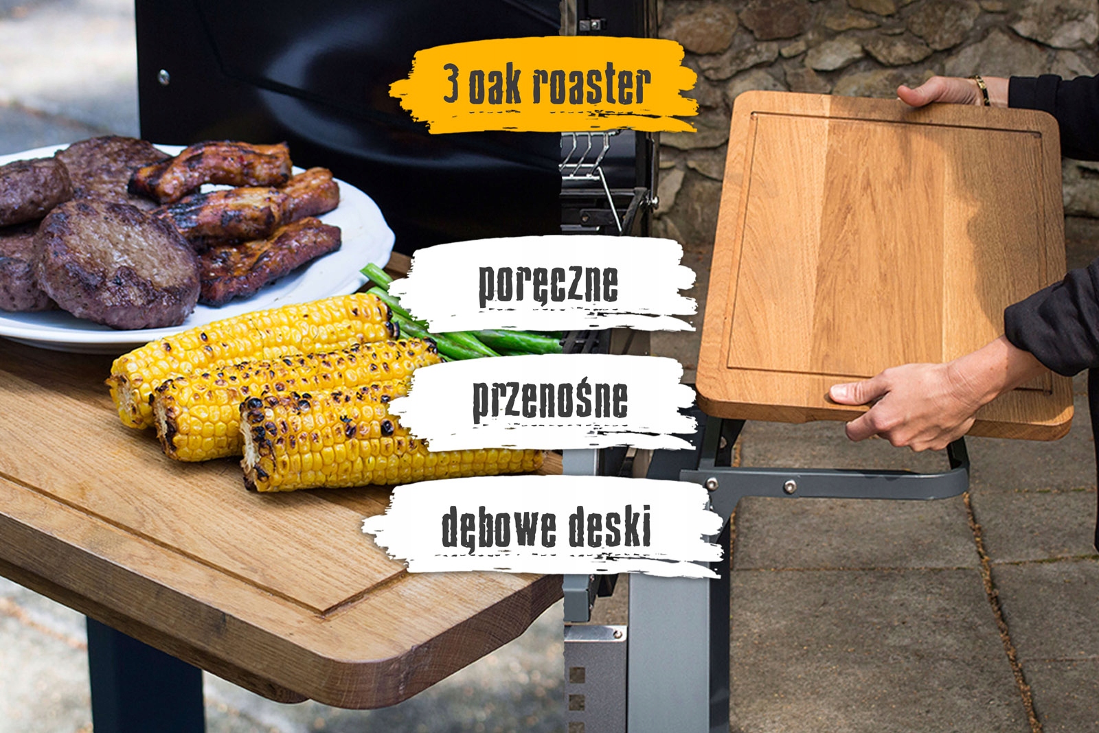 Ще одна зручність 3 Oak Roaster — знімні бічні кришки. Виготовлені вручну з дуба, елементи можна швидко зняти і використовувати як обробні дошки, підноси для перенесення готових страв або тих, які тільки чекають на гриль. Стільниці належним чином захищені, щоб ви могли насолоджуватися ними протягом багатьох років. Ваші страви будуть правильно виставлені, спонукаючи гостей до бенкету. Ви можете скласти мангал, сховавши бічні рамки стільниць, завдяки чому він займає набагато менше місця. Це особливо корисно, коли ви зберігаєте гриль на зиму або ховаєте його на дощові дні.