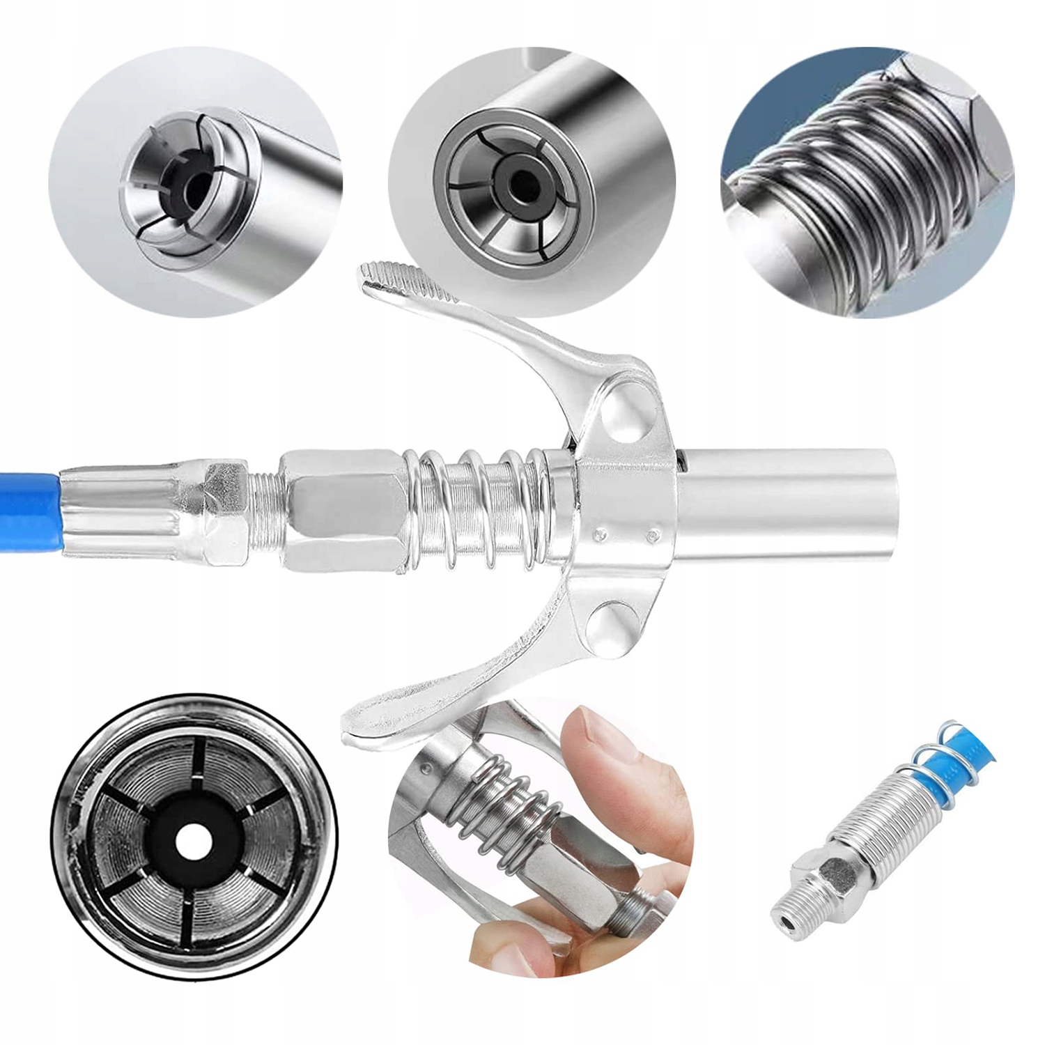 Сумісний із більшістю мастилок на ринку з 1/8" NPT з’єднувач. Чудовий і якісний запасний з’єднувач для мастильного пістолета для старого, пошкодженого з’єднувача для змащувального пістолета. Для вашої зручності також у комплекті безкоштовний шланг довжиною 30 см. У нас є не тільки нова, покращена та оновлена версія (високий тиск, герметичний , швидке заповнення мастилом, оптимізована товщина сталі, 6-кулачковий замок, керування однією рукою, найнижча вартість протягом усього терміну експлуатації автомобіля), але з’єднувач підходить для всіх стандартних 1/8" NPT мастильних пістолетів.