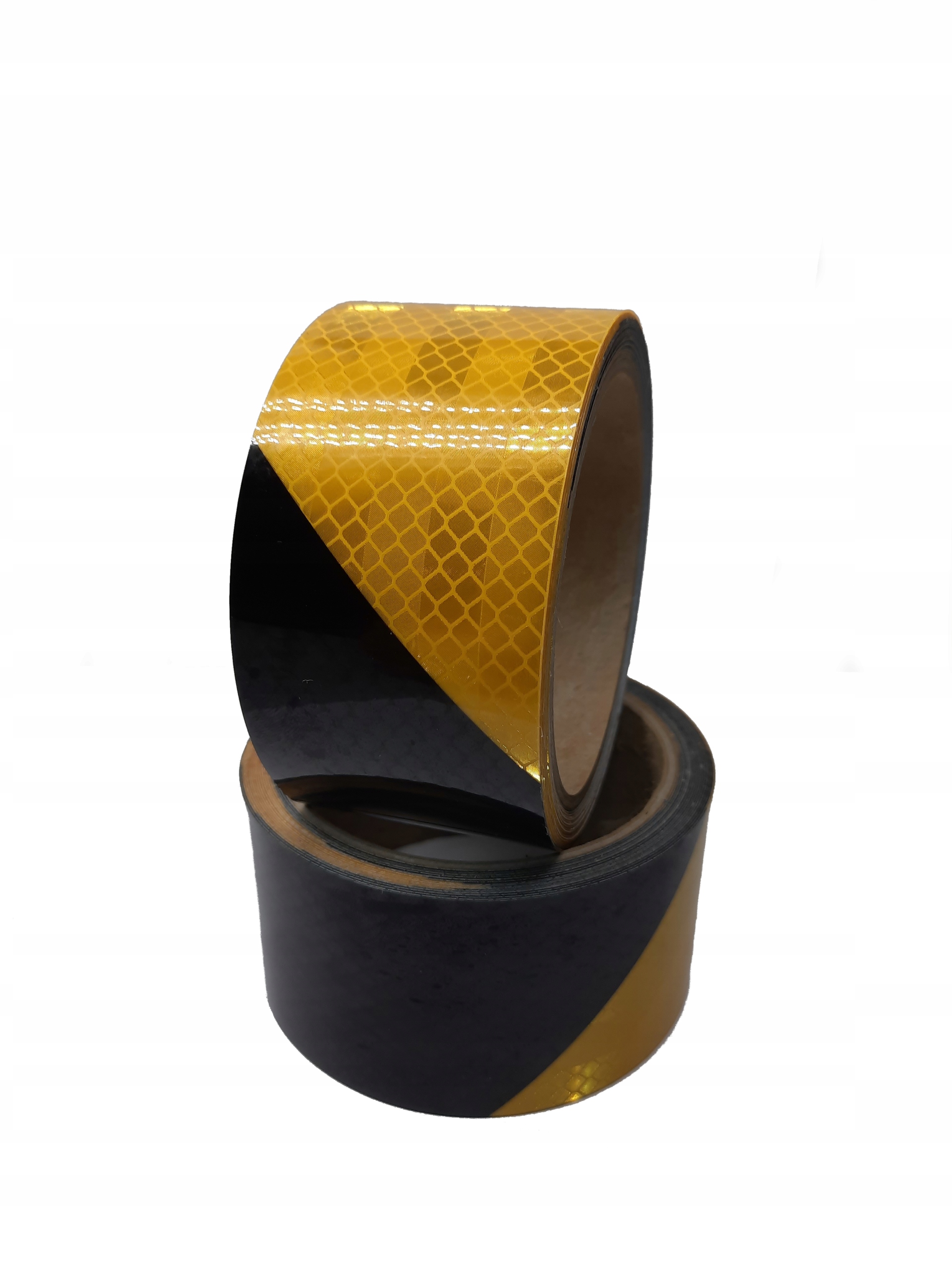 ПРЕМІУМ Жовто-чорна світловідбиваюча одностороння клейка стрічка з високою адгезійною міцністю.