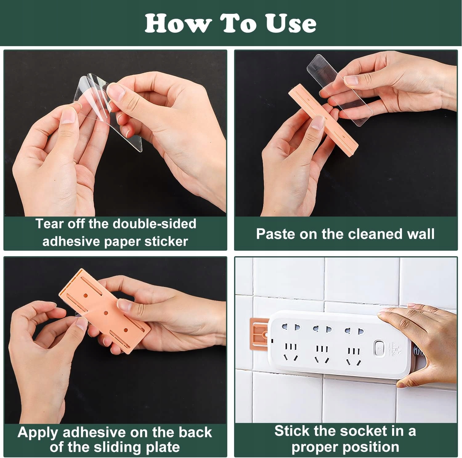 - Самоклеючий тримач: спеціально розроблений для подовжувачів живлення, WiFi-маршрутизаторів, коробок для тканин, адаптерів і пультів дистанційного керування, для кріплення розеток до настільних комп’ютерів