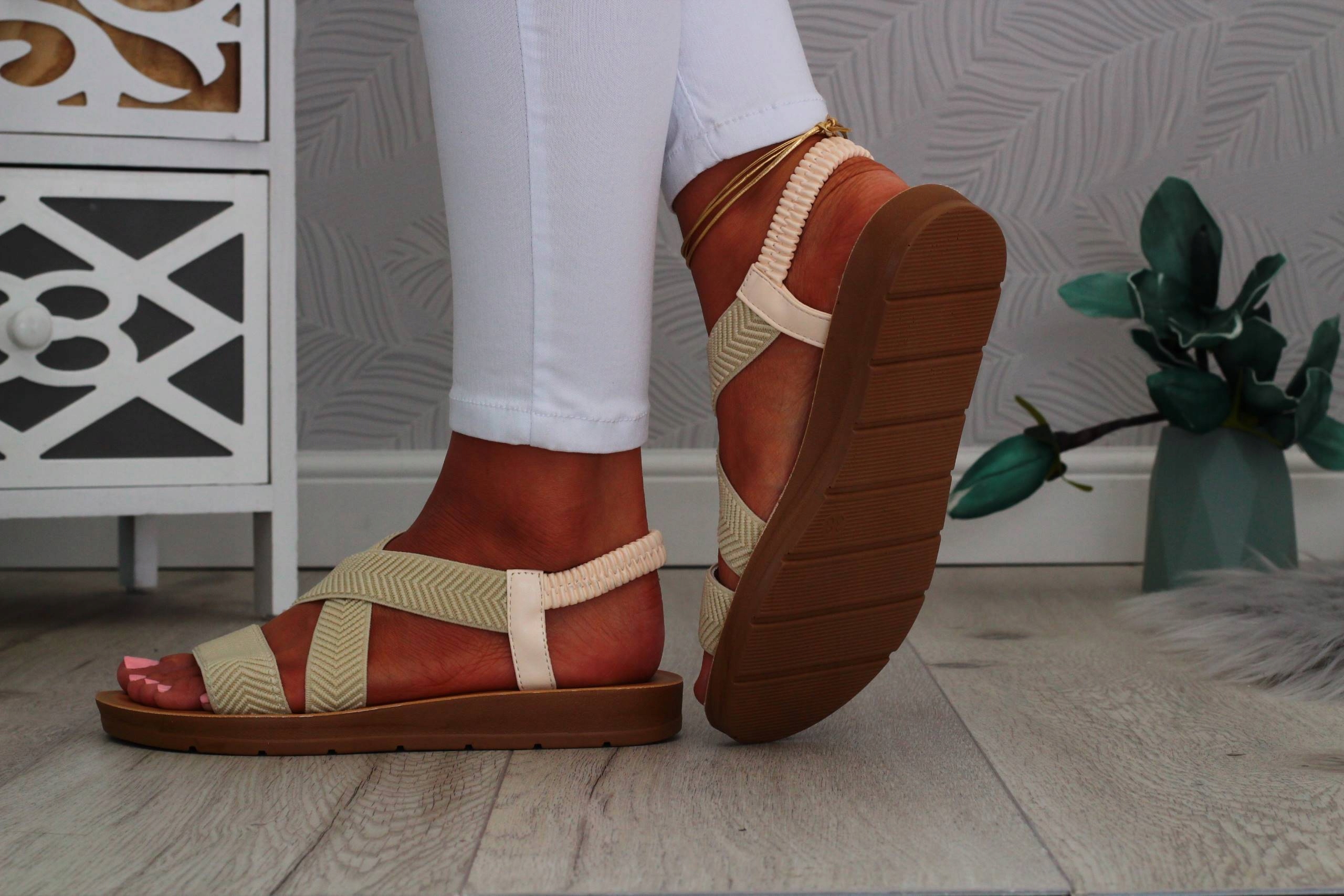 Жіночі бежеві босоніжки з ремінцями на плоскій підошві. Простий крій робить їх ідеальними для повсякденного взуття в літню спеку та легко поєднується з більш формальними стилями. Вони мають еластичний гумовий ремінь на п’яті для зручного одягання та регулювання під різну ширину стопи.