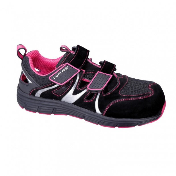 Жіночі босоніжки з композитним носком Lahti Pro L30604. Остання колекція робочого взуття для жінок. Верх взуття виготовлений із замшевої шкіри з додаванням сітчастої тканини для кращої вентиляції стопи. Прогумована підошва захищає від ковзання по сталевих і керамічних поверхнях, а композитний підносок захищає ногу від ударів. Взуття має електростатичні властивості і має світловідбиваючі елементи, які підвищують видимість людини під час роботи. Взуття має сертифікат CE та стандарт ISO 20345 і відноситься до другої категорії засобів індивідуального захисту.