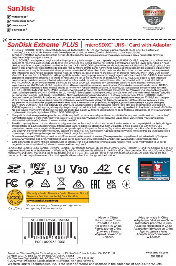Карти серії SanDisk Extreme PLUS стійкі до води, екстремальних температур, рентгенівського випромінювання та ударів, забезпечуючи безпечне середовище для даних зберігається на них. Вони сумісні зі стандартом UHS-I і підтримують мобільні пристрої останнього покоління. Уся продукція SanDisk виробляється відповідно до найвищих стандартів і проходить суворе тестування на кожному етапі виробництва, що забезпечує виняткову якість, продуктивність і надійність.