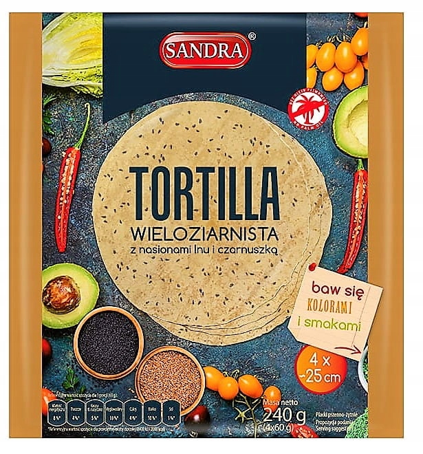 Тортилья - це простий спосіб приготування швидких, смачних і корисних страв для всієї родини. Збагачений насінням льону та чорним кмином, він набуває ще більш глибокого смаку. Оригінальною вечерею стануть класичні млинці, приготовані в теплому вигляді. Приготовані за кілька хвилин, охолоджені, вони ідеально підійдуть для роботи чи навчання, а якщо нарізати їх невеликими рулетиками, вони перетворяться на елегантну вечірню закуску. На звороті кожної упаковки є 3 простих способи приготування закусок. Тортилла мультизернова Сандра з насіння лляне і чорний кмин не містять пальмової олії. Виготовляється з найкращої пшениці, що гарантує відмінний смак і чудову еластичність тіста.