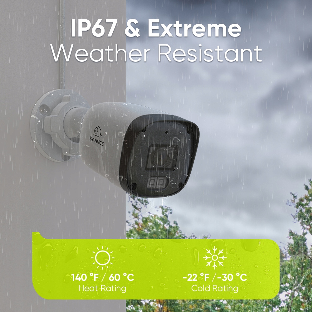 Опір IP67 оцінюється, а камери побудовані для наважиться до кожної погоди. Незалежно від сильних злив та лютого вітру, або екстремальних температур до 140 ° F і до -22 ° F.