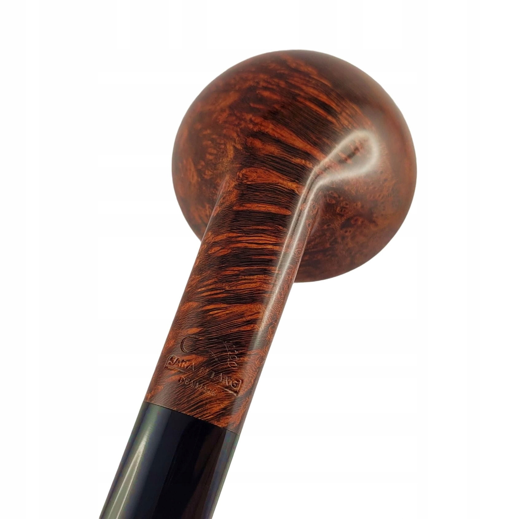 Шикарний прямий родезійець від чемпіона світового класу Тома Елтанга. Люлька виготовлена з дуже якісного шипшини, з чітким і щільним зерном, шипшина вибірково пофарбована в стилі Tom's підкуповує своїми деталями. Конічний мундштук виготовлений вручну з ебонітового стрижня, має деталізований прикус і точне прилягання до горловини трубки. Прекарбонізований камін. Люльки Sara Eltang, названі на честь дочки Тома Елтанга, розроблені та оброблені Томом у його майстерні поблизу Копенгагена, Данія. В наявності тільки один екземпляр, видно на фото, шкіряна обкладинка в комплекті.