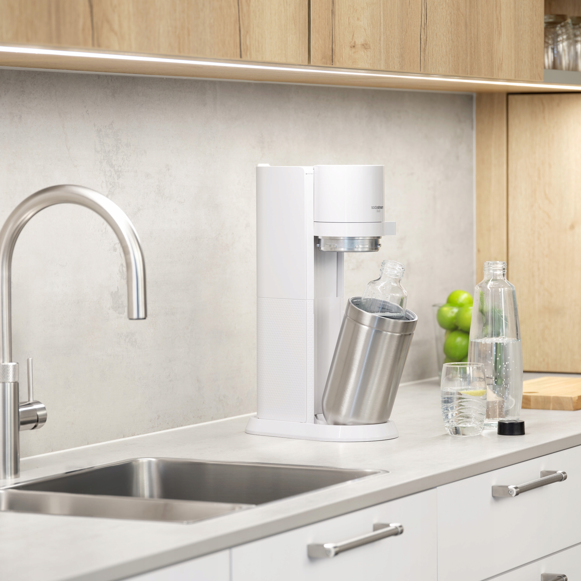 Зволожувач води SodaStream Duo в матовому білому кольорі чудово вписується в будь-який інтер'єр, як вашої кухні, так і кімнати офісу. Бульбашкова вода з сатуратора - чудова альтернатива газованим напоям в одноразових пластикових пляшках з магазину, які теж займають місце.
