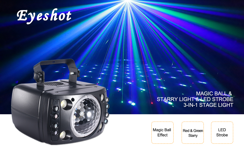Освітлення DJ Eyeshot, 3 на 1 етапне освітлення з променем дербі RGBW, червоно -зеленим зоряним світлом, світлодіодним стробовим та динамічним тентом, пілотом та контролем DMX, ідеально підходить для освітлення DJ Disco Party [Energy Class A +++]