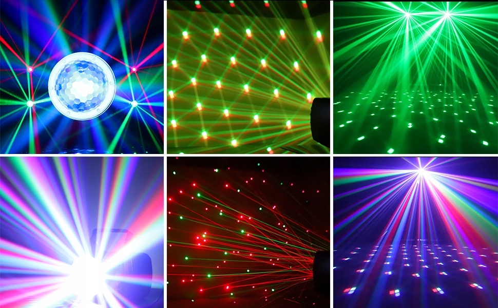 • Спеціальний ефект зоряного світла зі стробом: Ще одна особливість цього дискотечного світла - це здатність відображати ефект червоних та зелених зірок, червоне світло зірок має 120 МВт, а зелені зірки мають 50 МВт, а строб - з білого вечора, чітке та широке покриття зірки, що створює свою стадію або партію більш унікальною та романтикою.