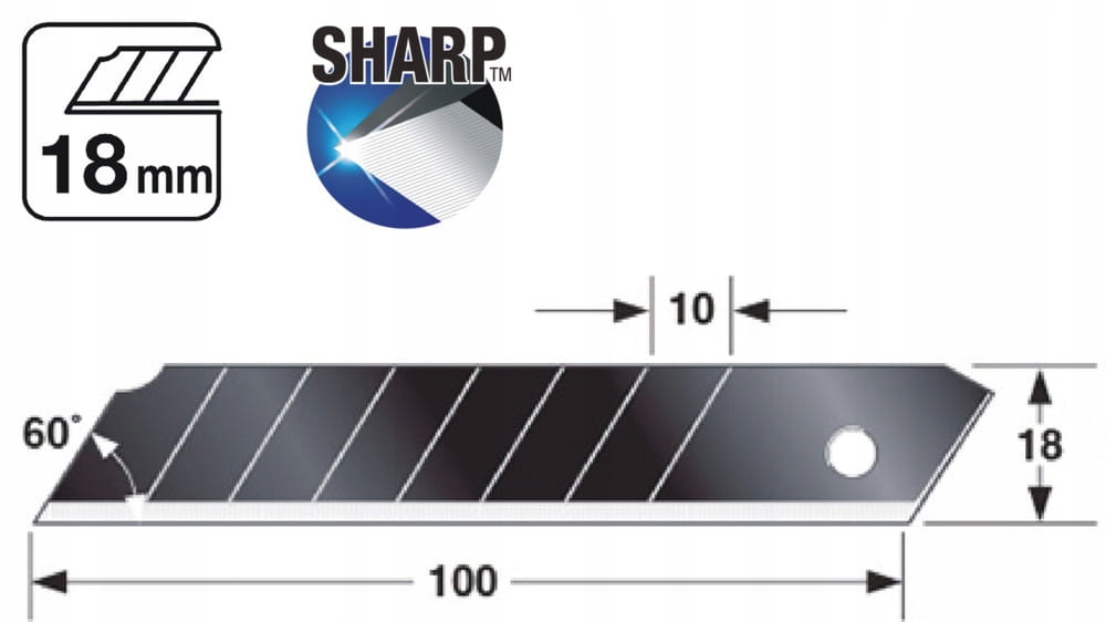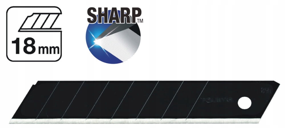 Професійне лезо чорного сегмента зламана 18 мм таджима від таджими до різних моделей ножів. Розрізані леза виготовлені з високоякісної сталі з точно загостреною та спеціально затіненою ріжучою кромкою. Довговічність і різкість лопатей є видатними завдяки якості сталі, з якої вони зроблені, а технології загартовування та заточення - останні. Ця сталь виробляється в Японії, і традиція зламаної виробництва снарядів на Тайімі досягає понад 100 років. 10 лопатей розміщуються в пластиковому журналі, який можна безпечно, легко і зручно зняти. сегментарні леза '' razar black '' ідеально підходить для різання матеріалів, де потрібна швидкість і непогашена різкість різання, наприклад. У роботі з папером, реклама для приклеювання в рекламі, шпалерах, вкладишах, стрічках та всіх інших матеріалах, для яких використовуються розбиті осколки.