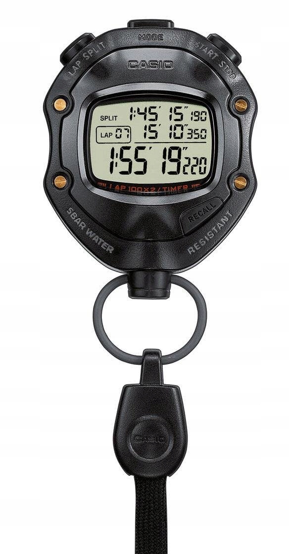 Секундомір CASIO HS-80TW-1EF. Клас герметичності 50М. Пластиковий корпус. Пам'ять 2 x 100 проміжних часів (LAP). Таймер інтервалів з автоповтором. Футбольний секундомір. Лічильники. 12 сигналізаторів. Годинник