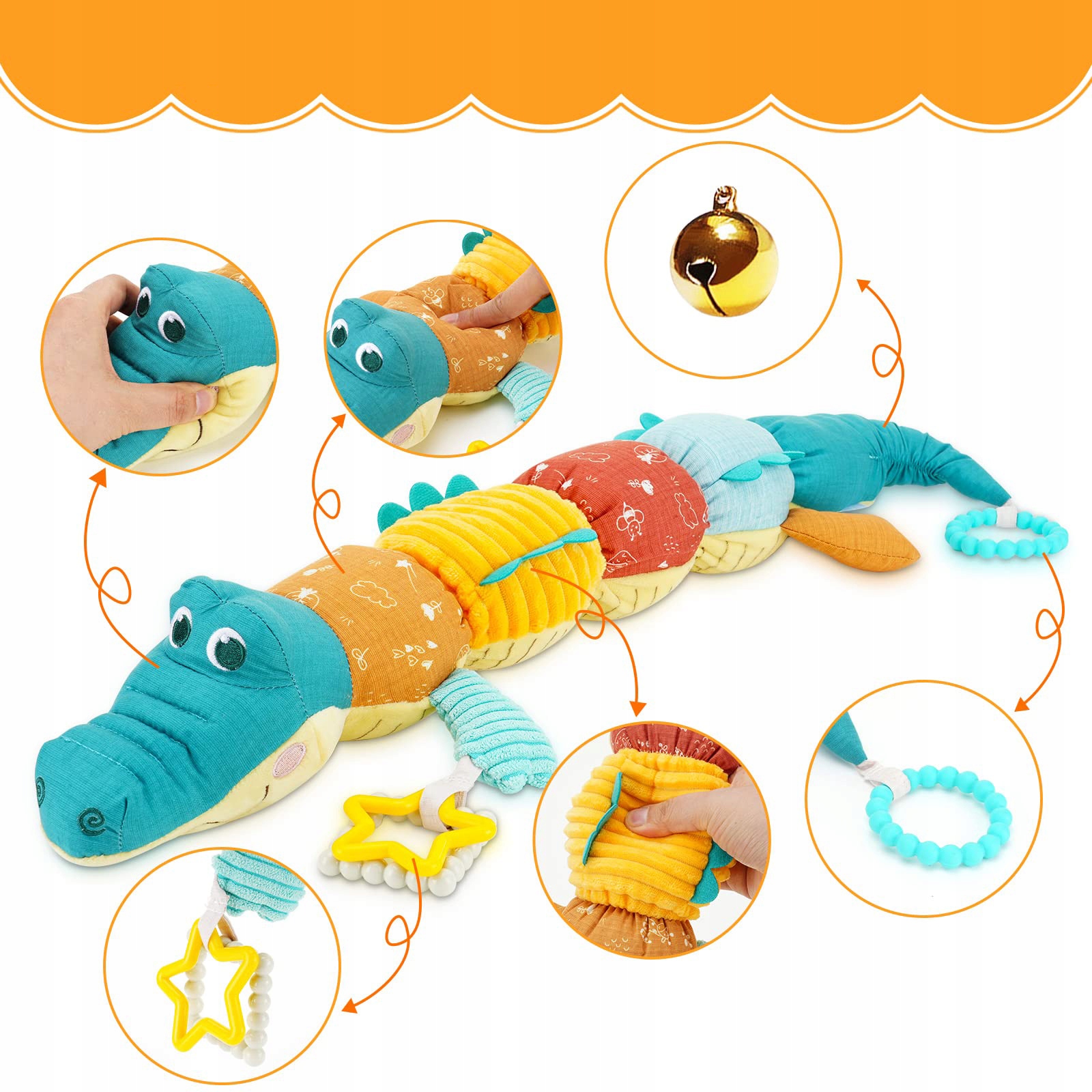 【М'які сенсорні іграшки для немовлят】 Розділ 1 Розділ 5 та Розділ 6 Плюшевого іграшкового корпусу є плавним дотиком, що видає звук шелестної газети, розділи 2 та 4 можуть видати звук З хрусткої газети, розділ 3 - це м'яка тканина з м'яким дотиком, хвіст - це силіконове продуктове кільце, а дзвін дзвонить після формування лівою лапою. Різні дотики стимулюють їх взаємодію, практикують ранню здатність та жувальну здатність у немовлят.