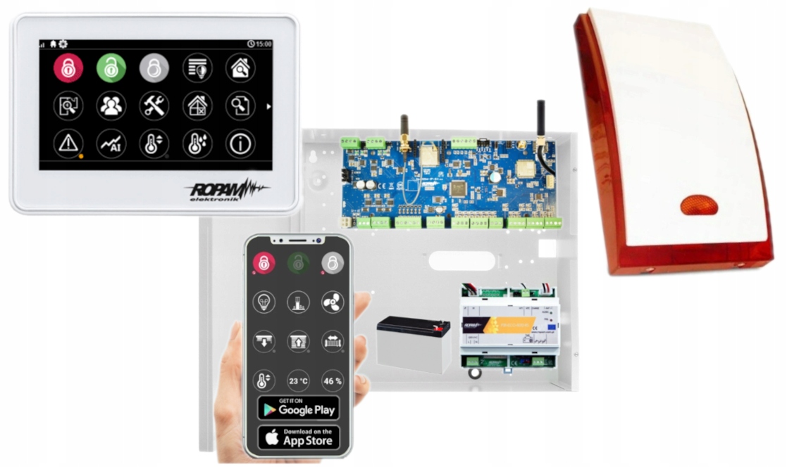 Сигналізаційна панель Ropam NeoLTE-IP-64-SET з автоматизацією будівлі, GSM комунікатором і модулем WiFi, в комплекті сенсорна панель (білий) і сирена сигналізації
