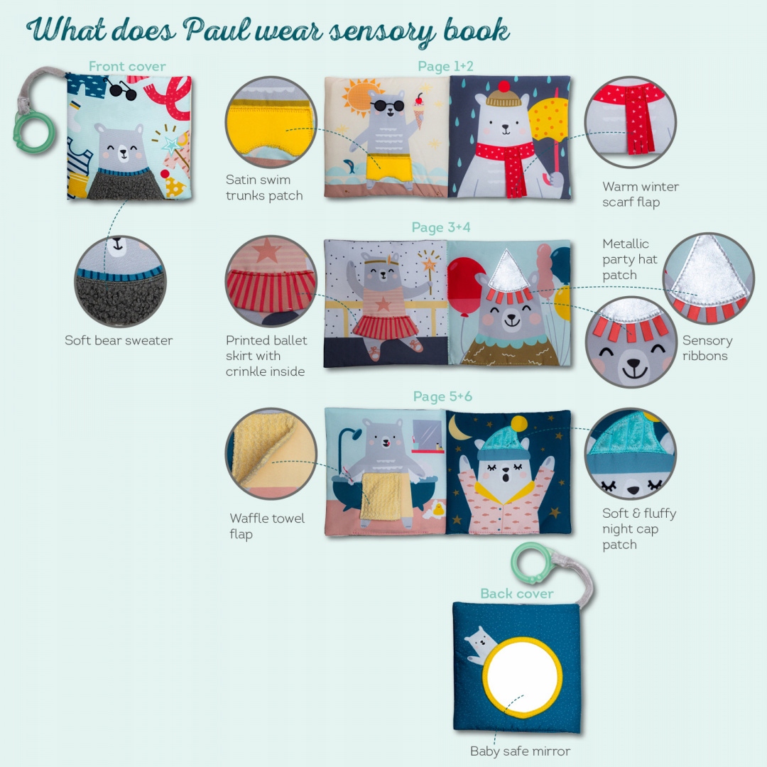 - Інтерактивні м’які сторінки в книжці «Що носить Пол» — це весела та м’яка розвага в колясці з багатьма функціями відкриття та яскравими кольорами, які малюки можуть досліджувати. li>