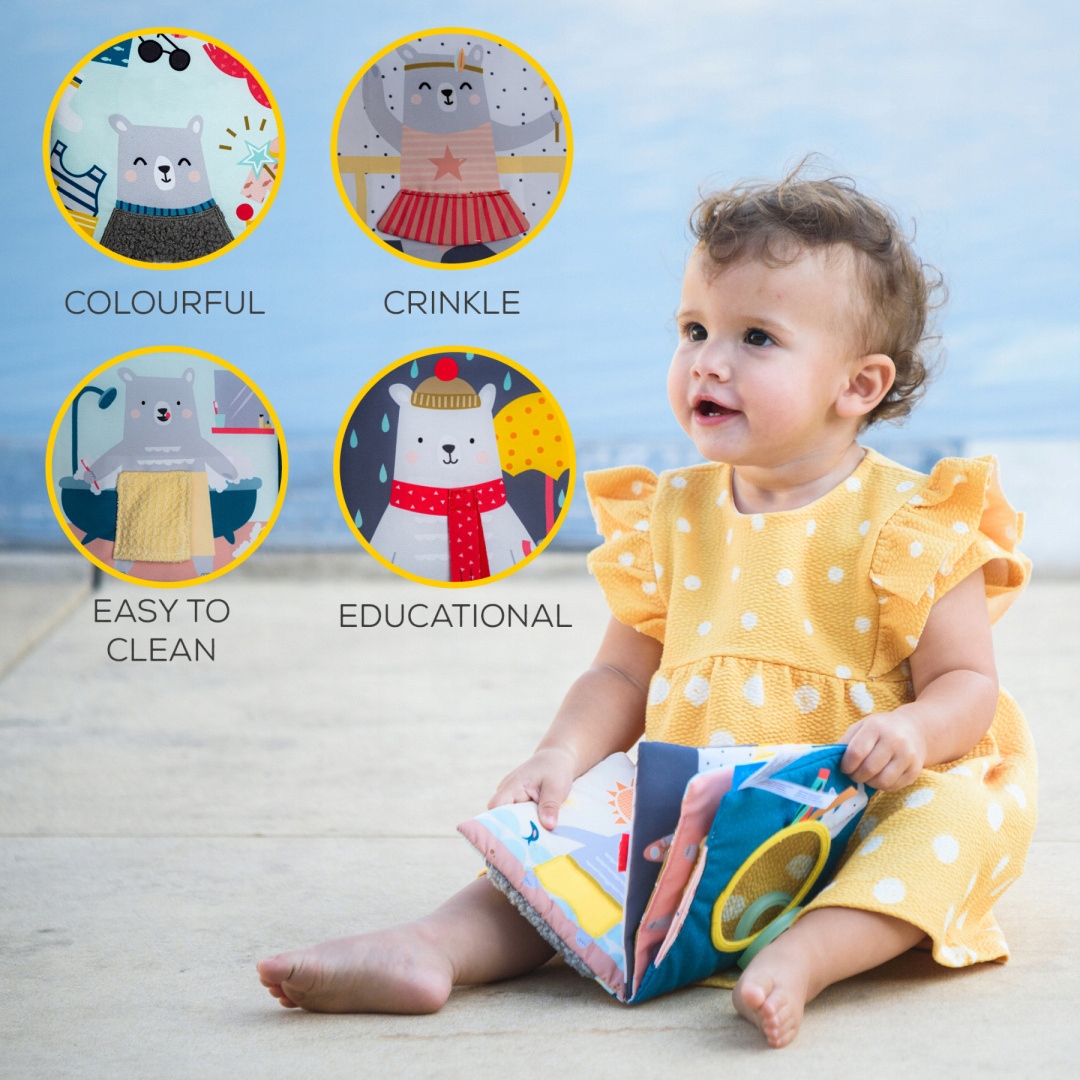 - Зморщена двостороння м’яка книга, яка захоплює дитину та заохочує до розвитку у веселий та захоплюючий спосіб!