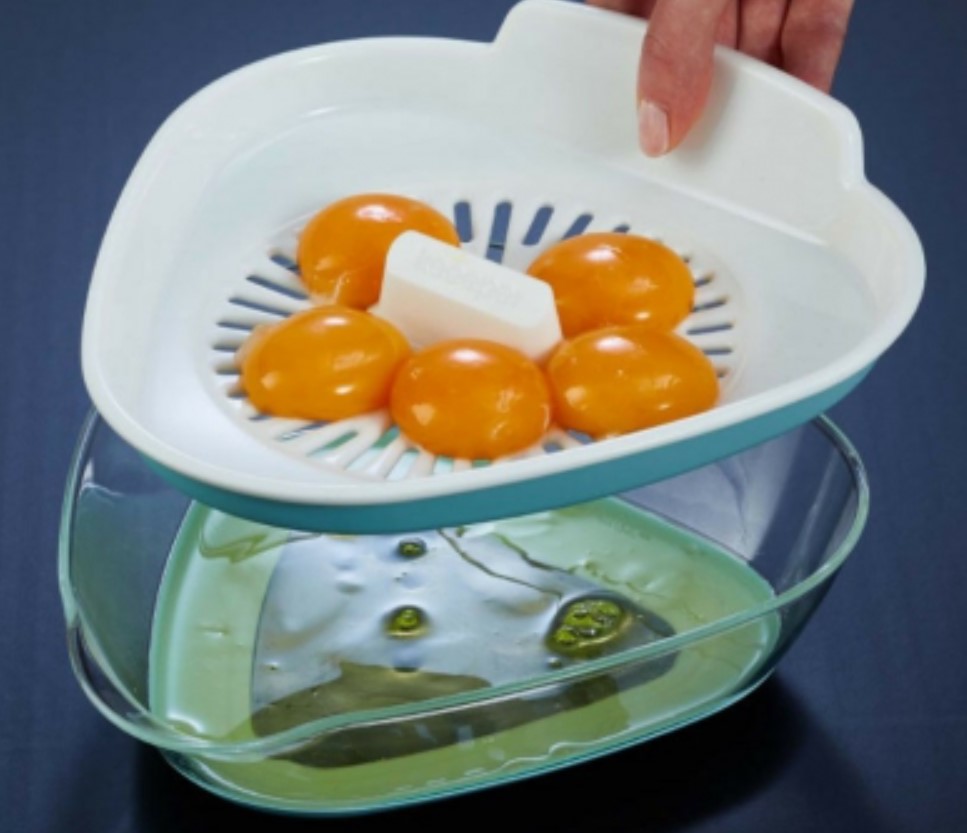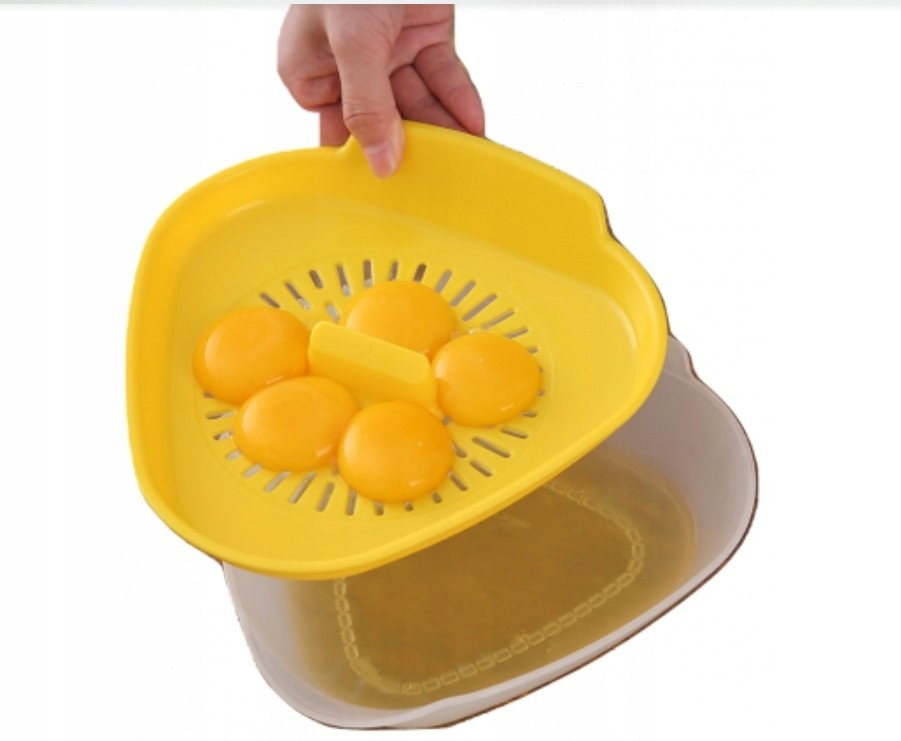 Пристрій для відокремлення яєць, завдяки якому відокремлення жовтка від білка стає простою грою. Наш новий продукт має спеціальну кромку для легкого розбивання яєць. Верхня поверхня сепаратора спеціально профільована, щоб не пошкодити жовток. Нижня чаша, у свою чергу, може вмістити до 10 яєць (приблизно 350 мл), а також має дозатор для полегшення виливання яєчних білків. Крім того, неслизька поверхня гарантує захист від розливання яєчних білків.