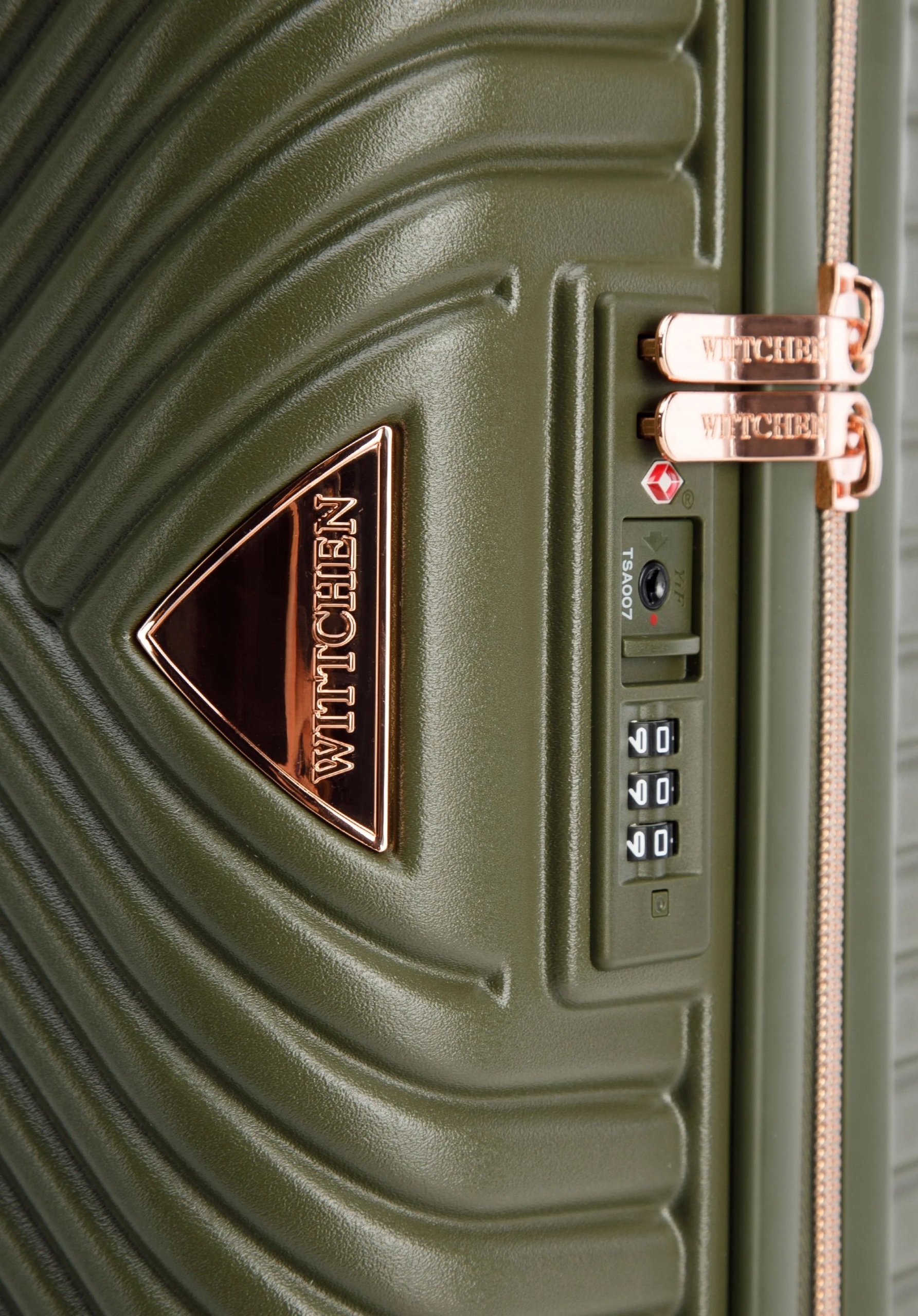 середньої валізи, виготовленої з полікарбону з матовою обробкою. Це дизайнерський дизайн з блискучою рожевою золотою фурнітурою. Колеса, виготовлені з пластику ABS з гнучким покриттям. Внутрішня частина валізи покрита бежевою підкладкою з логотипом Wittchen.