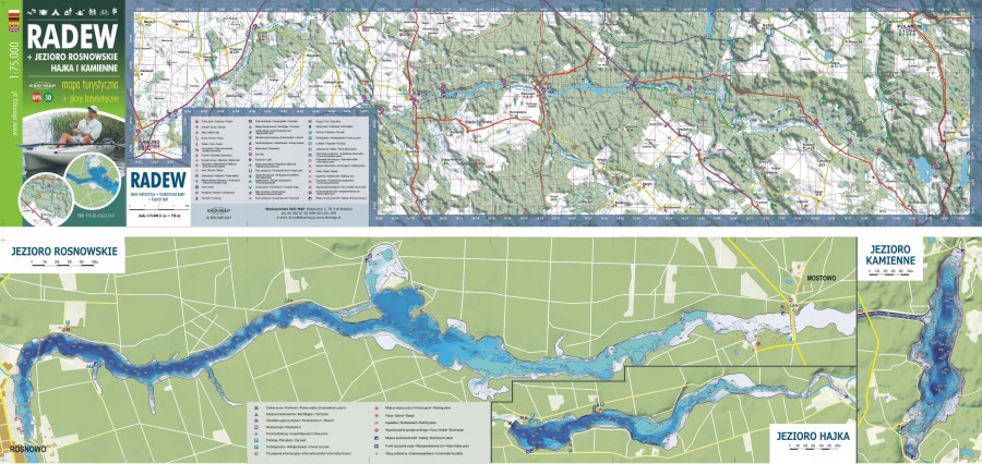 Картографічна частина: туристична та байдарочна карта річки Радева, батиметричні карти озер: Росновське, Гаєк та Каменне, легенда польською, німецькою та англійською мовами.