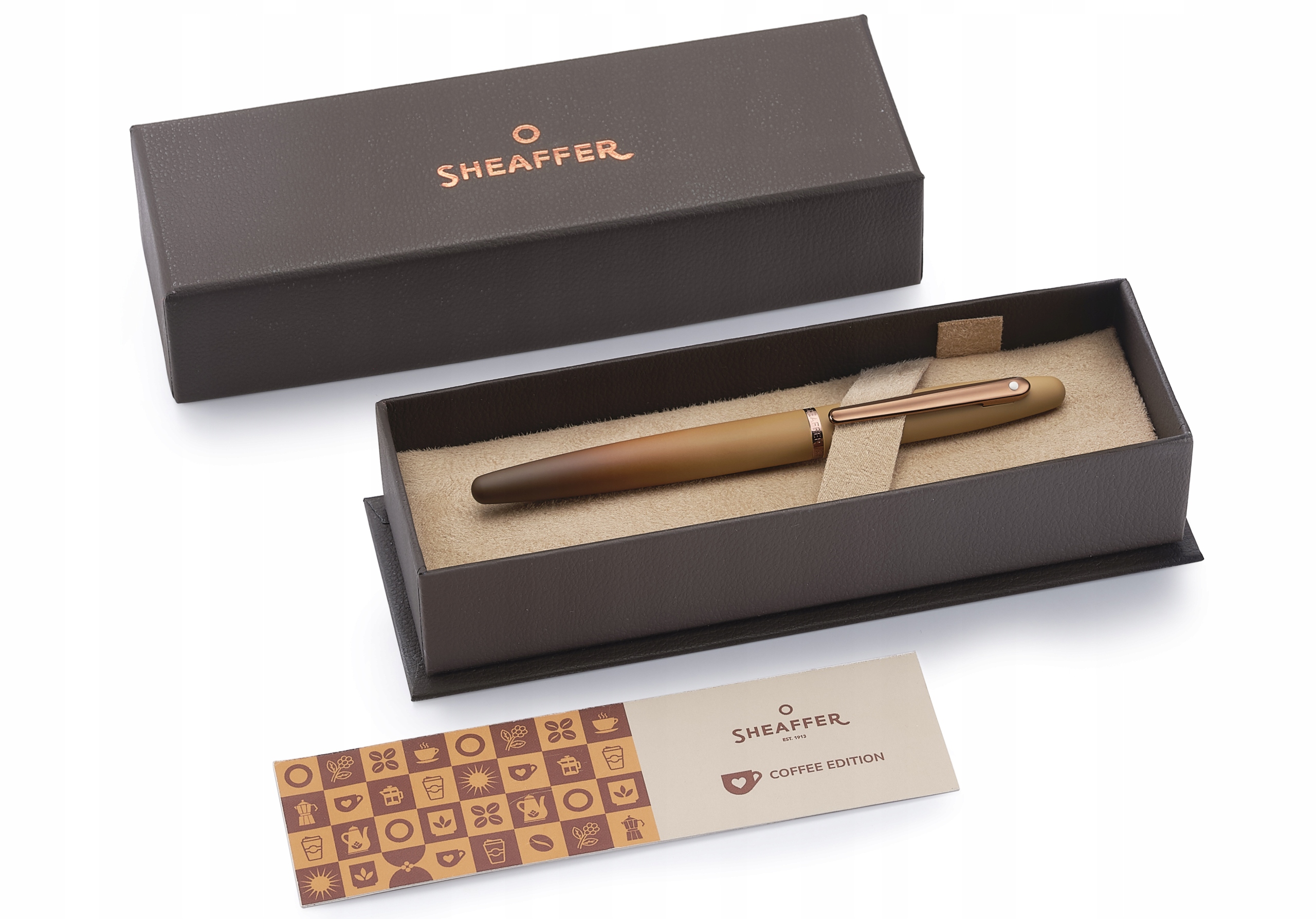Sheaffer VFM Caffee Edition — серія вічного шарму та найвищої якості. Красива, класична модель авторучки, оснащена так само красиво оформленим пером у формі моделі з найпопулярнішою середньою товщиною F. Корпус і ковпачок виготовлені з латуні, покриті багатошаровим матовим кавово-коричневим лаком. Затиск і каблучка покриті шаром полірованого PVD-золота. Передня частина, що тримає перо, виконана з пластику. Що відрізняє продукцію Sheaffer, так це простий елегантний затиск з білою опуклою крапкою і широким кільцем з вигравіруваним логотипом. Ручка була упакована в елегантну подарункову коробку компанії. У набір входить 1 чорний і 1 синій картридж, чорнильний поршень і подарунковий пакет. Повний набір як подарунок для поціновувачів кави та ентузіастів, які цінують маленькі розкоші в житті.