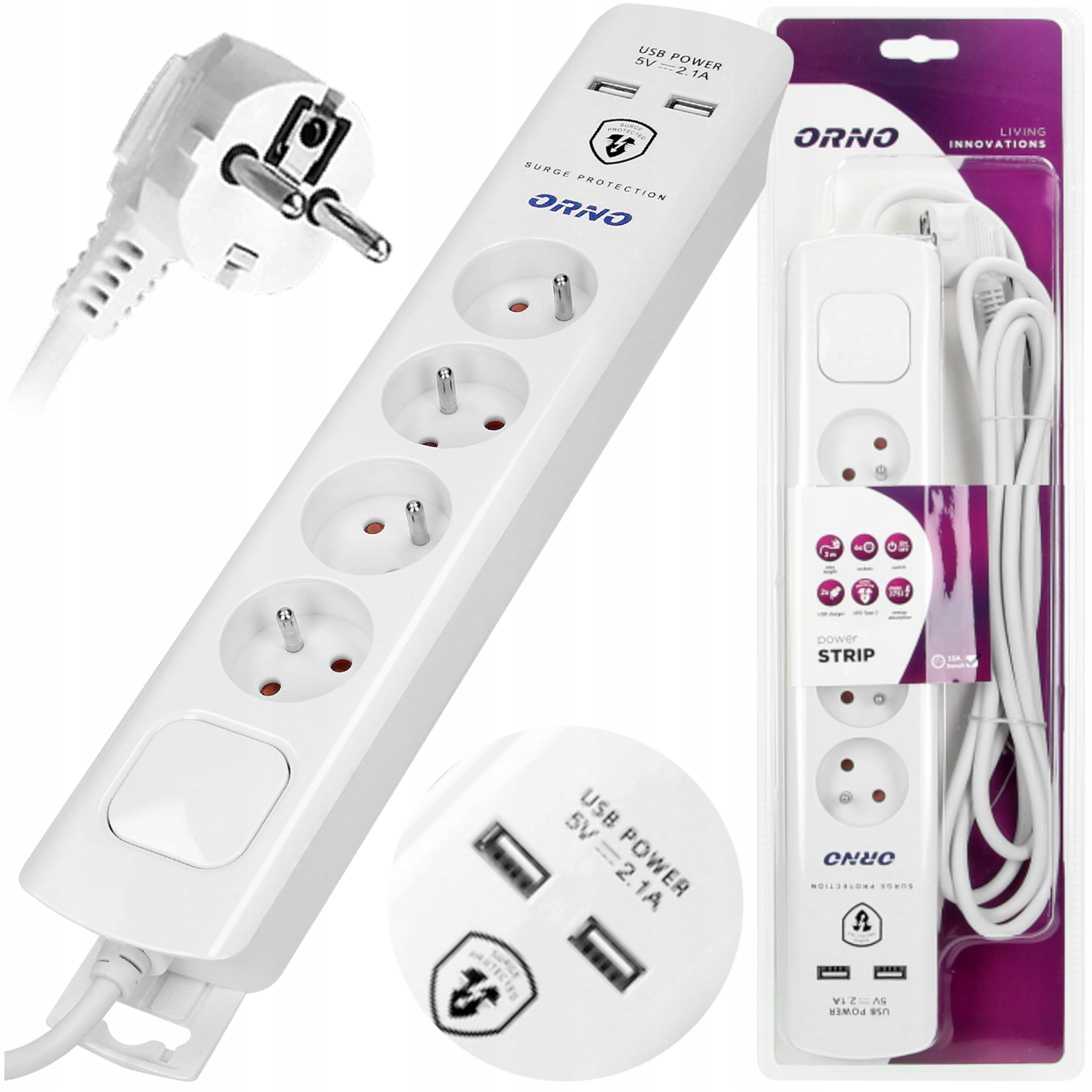 ПОДДІЛЮВАЛЬНИК ЖИВЛЕННЯ ЗАХИСТУ ПЕРЕПАДАМИ 4 РОЗЕТКИ + 2 USB, 3 МЕТРИ КАБЕЛЬ