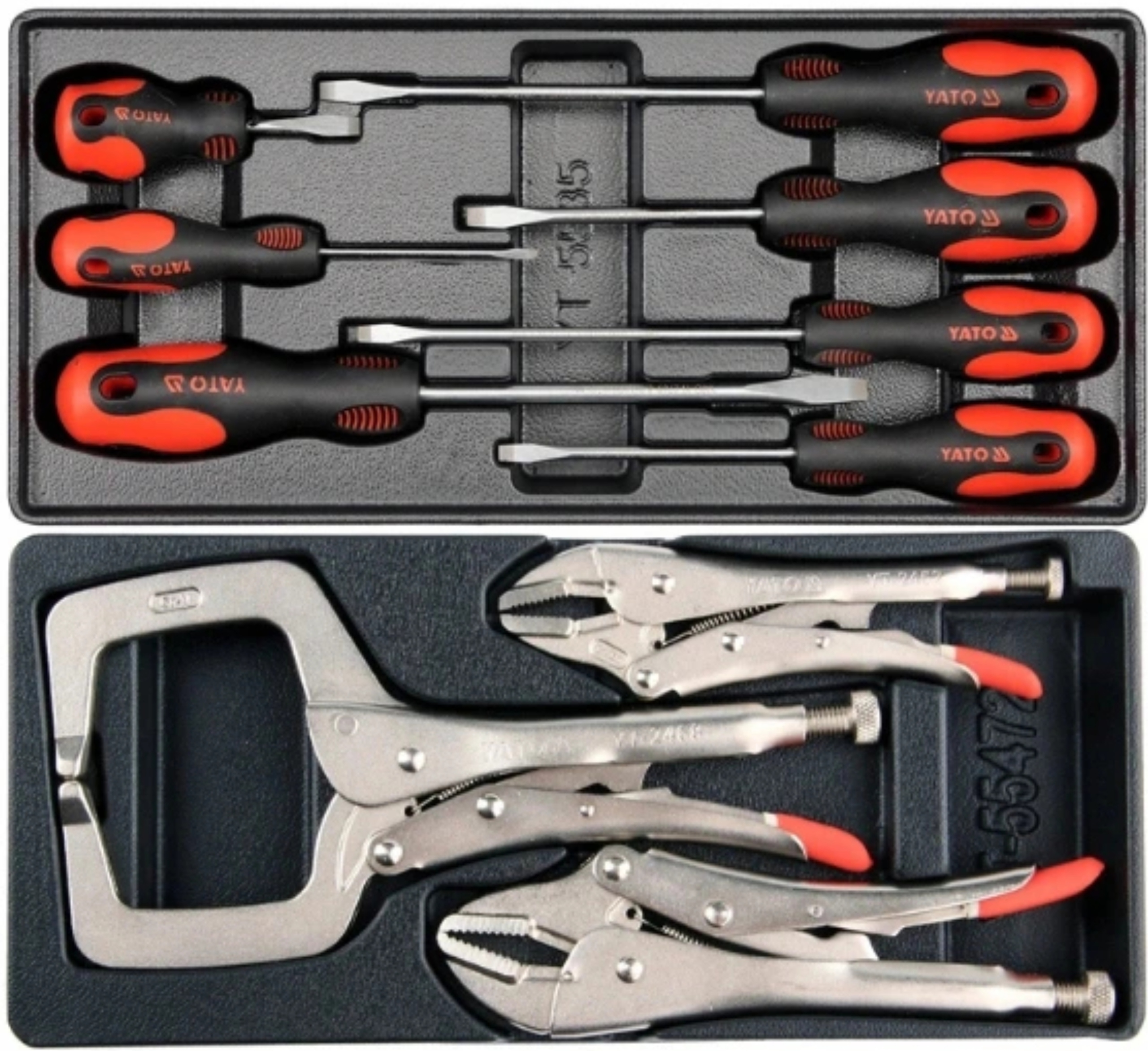 Інструментальна шафа YATO. Оснащений 7 ящиками на кулькових напрямних. У 5 верхніх ящиках міститься 165 ретельно відібраних інструментів. Профілі виготовлені з подвійного сталевого листа - універсальна перфорація дозволяє комплектувати шафу додатковими елементами. Центральний замок та індивідуальне замикання кожного ящика.