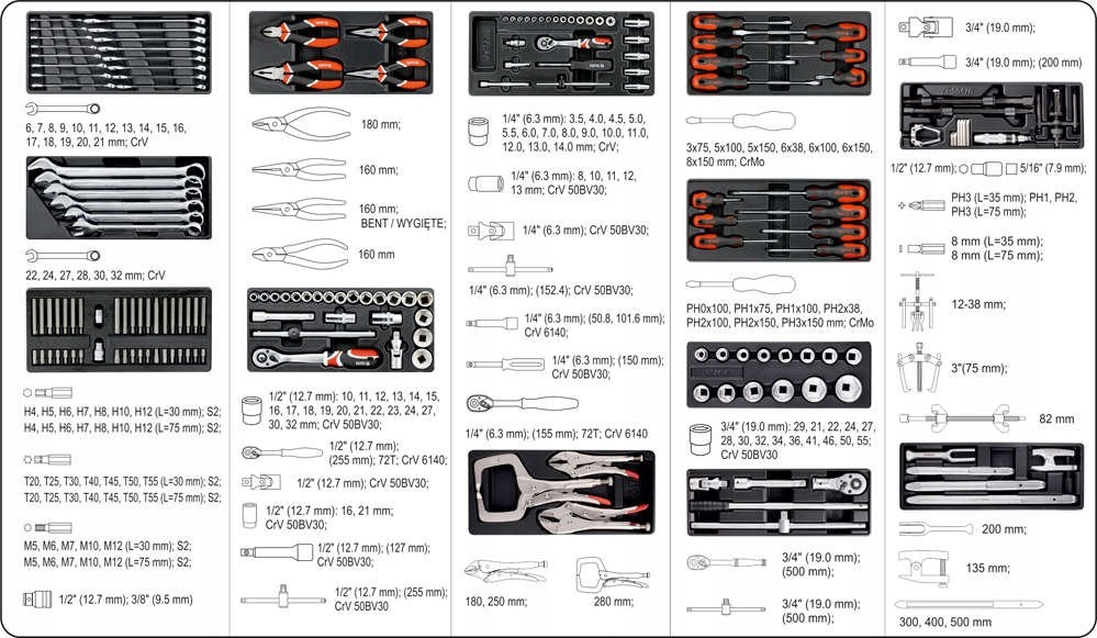 ВСТАВКА 4: шестигранні гнізда 1/2" YT-1203~YT-1243 (10, 11, 12, 13, 14, 15, 16 , 17, 18, 19, 20, 21, 22, 23, 24, 27, 30, 32 мм), тріскачка YT-0732 1/2", CRV 6140, 72T / подовжувач YT-1247 1/2" 127 мм / YT-1252 кардан 1/2", YT-1253~YT-1254 гніздо для свічки 1/2", 16 мм, 21 мм, YT-1243 ручка Т-подібного типу 1/2" 255 мм