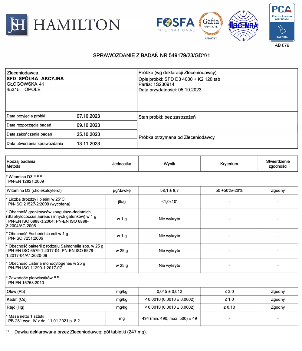 - SFD D3 4000IU + K2 це дієтична добавка, що містить вітаміни D3 і K2 (менахінон-7). Регулярне вживання вітаміну D3 сприяє правильному засвоєнню кальцію, підтримує здоров'я кісток і зубів і благотворно впливає на правильне функціонування м'язів і імунної системи.