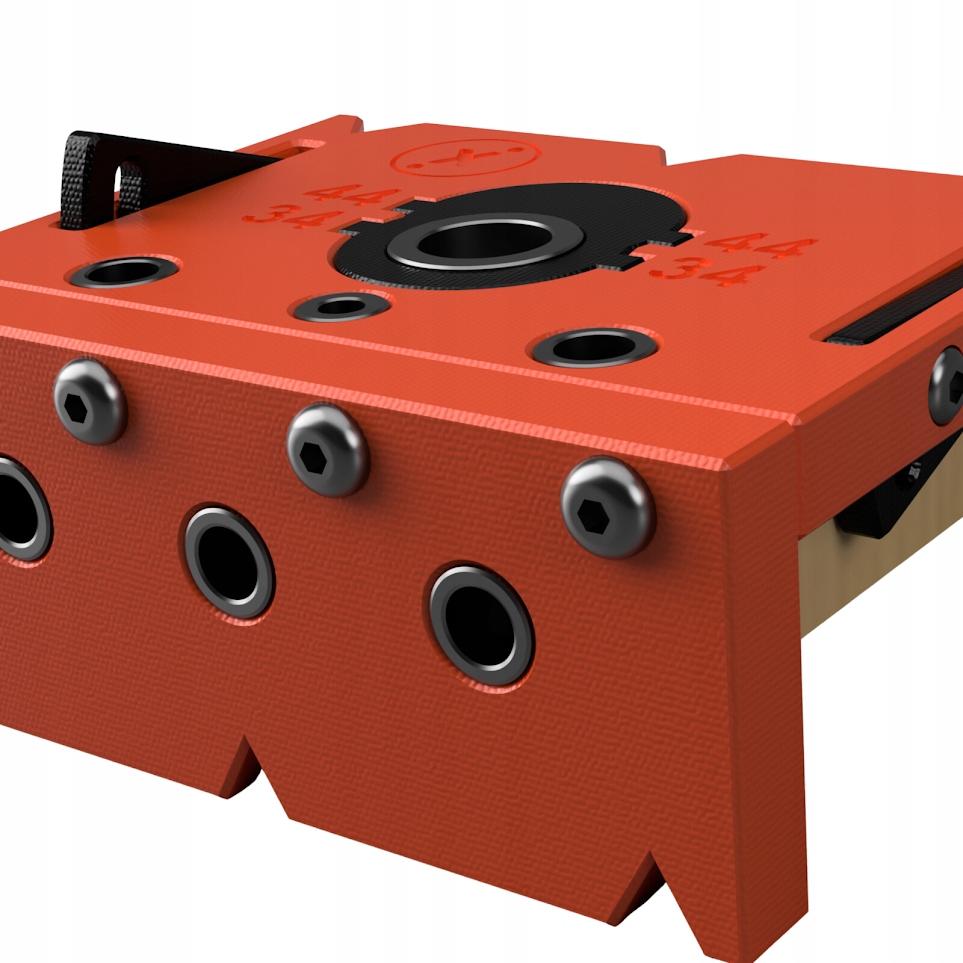 Шаблон для свердління ексцентрикових з'єднань з довжиною хвостовика 34 або 44 мм і діаметром ексцентрика 15 мм. Пристрій для плати 18 мм. Можливість використання з плитами іншої товщини (після свердління ексцентрикового отвору перевернути форму та просвердлити в кільці отвори під шпильку та шпильку 8 мм), що забезпечує рівномірне торцювання матеріалу.