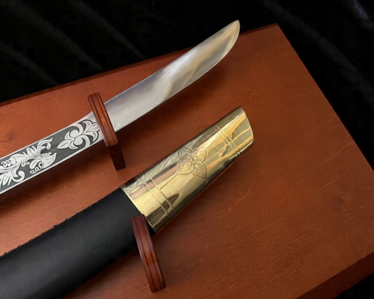 НОЖНИ: дерев'яні, оброблені чорною натуральною шкірою. Латунні фітинги з гравіюванням з обох сторін не потребують обслуговування