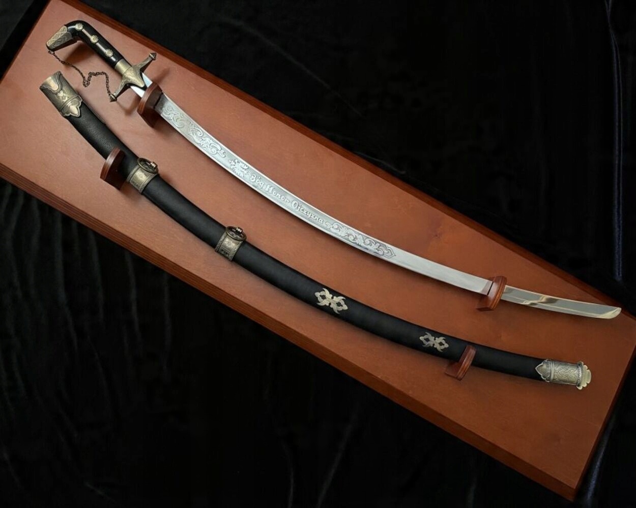 На клинку гарний рослинний орнамент із зображенням орла в короні та гравіюванням: Слава Богу Вітчизні