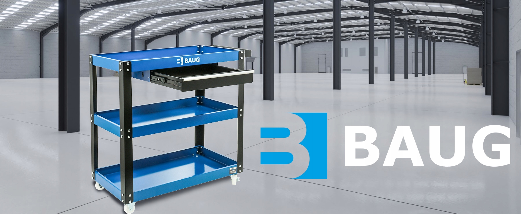 Професійний універсальний інструментальний візок BAUG для будь-якого використання в майстернях. Перевагами є 2 обертових колеса, 3 полиці та висувний ящик.