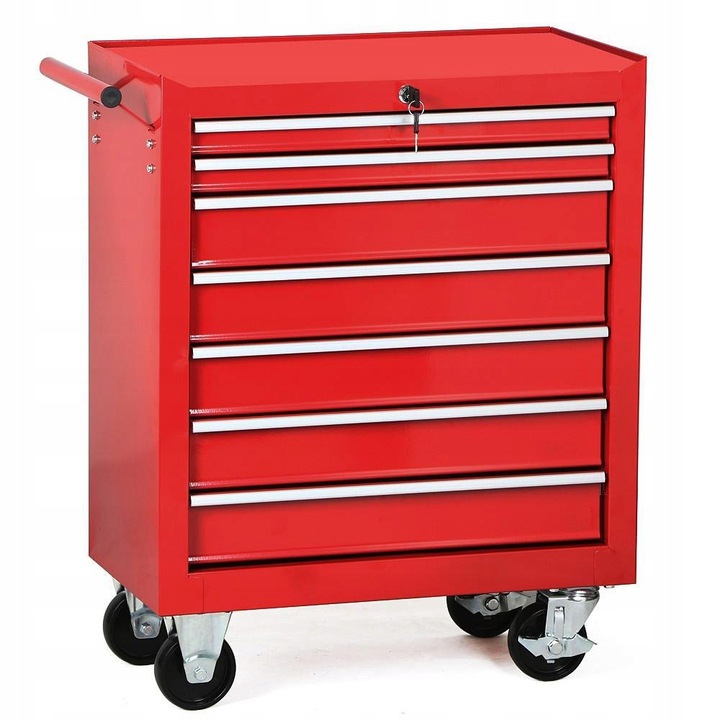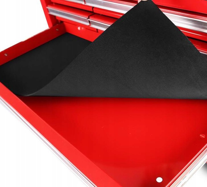 Шафа для інструментів — це обладнання, необхідне в кожній автомобільній майстерні, гаражі чи будинку. Шафа має 5 глибоких ящиків і 2 неглибоких висувних ящика, вистелених протиковзким килимком.Виріб виготовлено з високоякісної сталі, а зовнішні та внутрішні краї подвійно посилені.Шафа стоїть на 4 міцних колесах, 2 фіксованих і 2 поворотних з замками.Якісний продукт забезпечить безпроблемне використання
