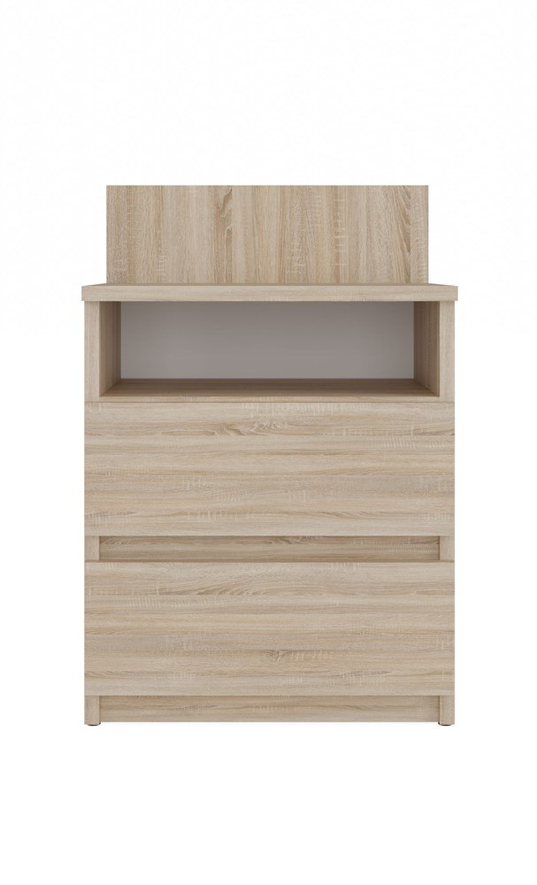 Дві місткі шухляди на роликових напрямних забезпечують зручне та безпечне зберігання. Верхня частина шафи ідеально підійде для нічника, будильника або декоративних аксесуарів, які хочеться завжди мати під рукою.