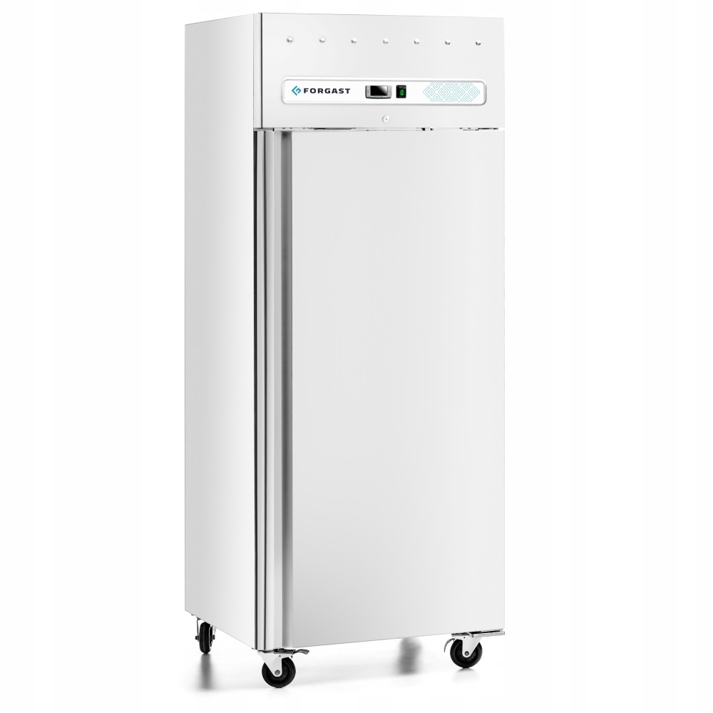 Холодильна шафа фірми Forgast об'ємом 685 л. Корпус з білого лакованого металу. Внутрішня частина виготовлена з нержавіючої сталі AISI 304, кути камери закруглені для більш зручної гігієни. Оснащений 3 полицями-решітками стандарту GN 2/1. Можливість розміщення полиць на 22 рівнях. Відстань між полицями 4 см.