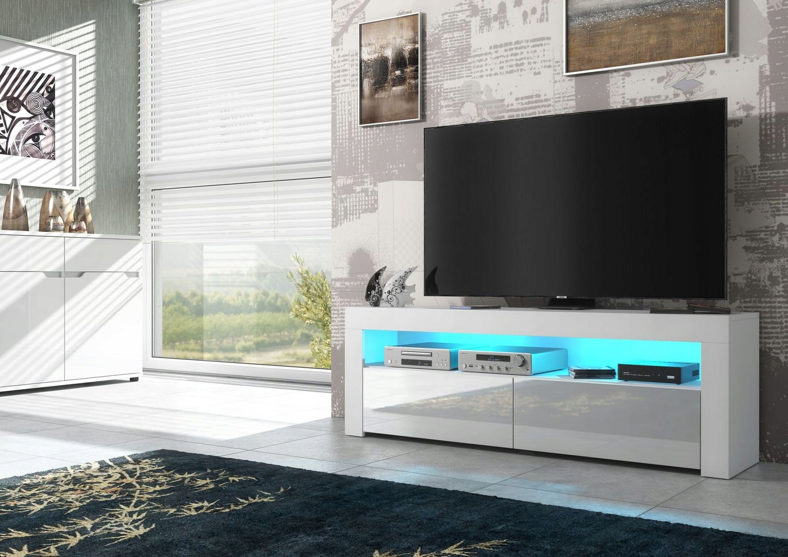 Сучасна тумба під телевізор, конструкція якої виготовлена з високоякісного ламінованого картону товщиною 16 мм, що забезпечує довговічність. Передня частина шафи оздоблена глянцевим МДФ, що надає шафі елегантності. Стулки додатково оснащені газовими амортизаторами, які запобігають хлопанню дверей при закриванні. Оригінальний дизайн шафи робить його привабливим, але при цьому він на 100% виконує свою функцію - на стільницю можна поставити телевізор, а в його просторому ніші з легкістю поміститься вся техніка - DVD, декодер або ігрові приставки. Додатково ніша оснащена світлодіодним підсвічуванням синього кольору. Шафа доступна в різних кольорах і двох ширинах, тобто 130 см і 160 см. Меблі ідеально впишуться в сучасні та дизайнерські інтер'єри.