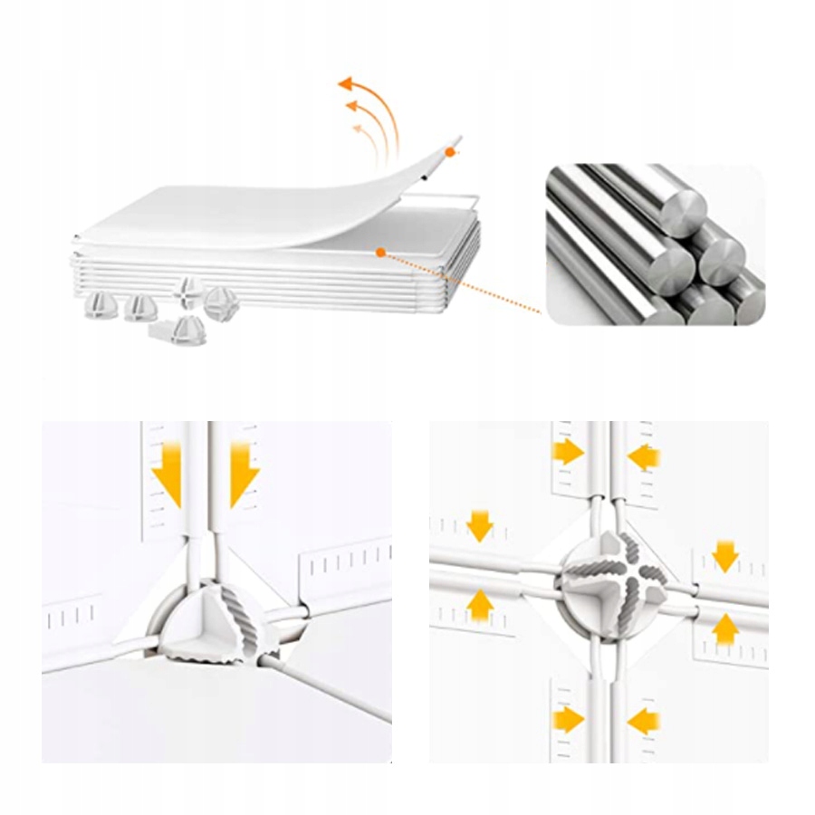 ПП пластикові панелі з металевим каркасом і з’єднувачами з АБС. Максимальна вантажопідйомність кожного куба становить приблизно 5 кг