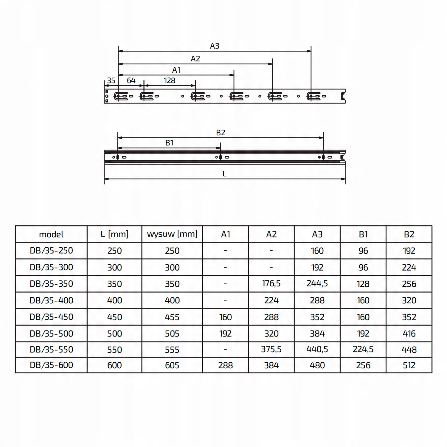 Кулькова напрямна DB35, H-35 мм заввишки, з повним висуванням, ідеально підходить для меблевих ящиків, полиць для клавіатури тощо. демонтовані частини напрямної та механізм, що запобігає випаданню ящика. Якісний путівник за низькою ціною. Продукт польського виробника Amix. У комплект входять ліва та права направляючі.