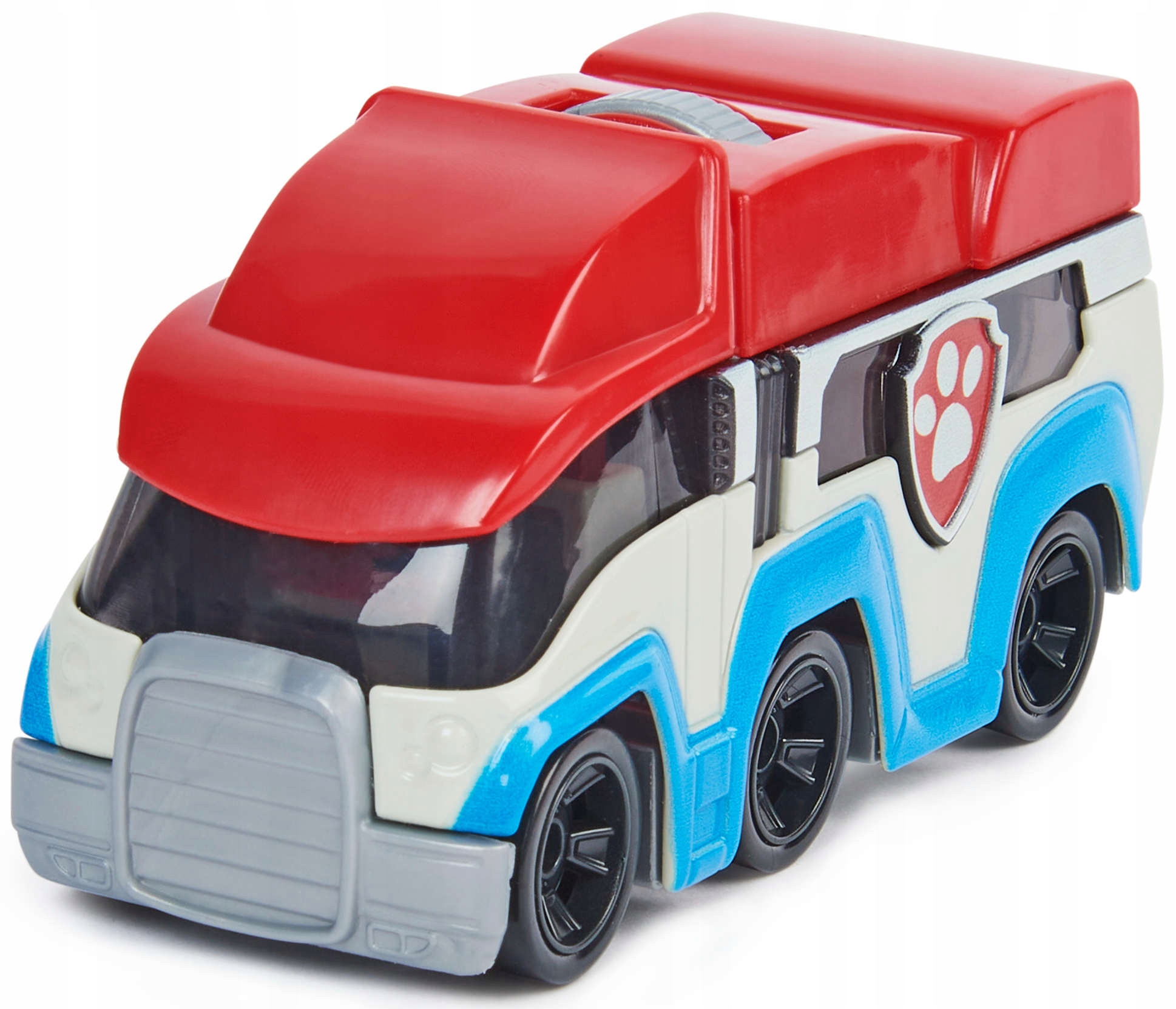 Патруль біло-синьо-червоного кольору з тонованими вікнами та оснащений 12 колесами, що дозволяє йому стабільно пересуватися по рівних поверхнях.