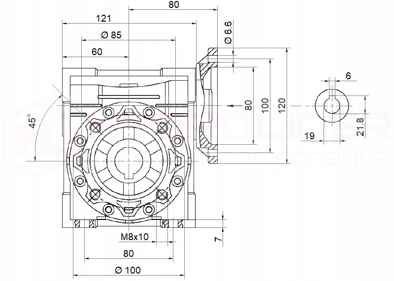Редуктор HMRV 50 призначений для зниження вихідної швидкості в 1- і 3-фазних електродвигунах з механічним розміром IEC80, оснащених фланцем B14 із зовнішнім діаметром 120 мм.