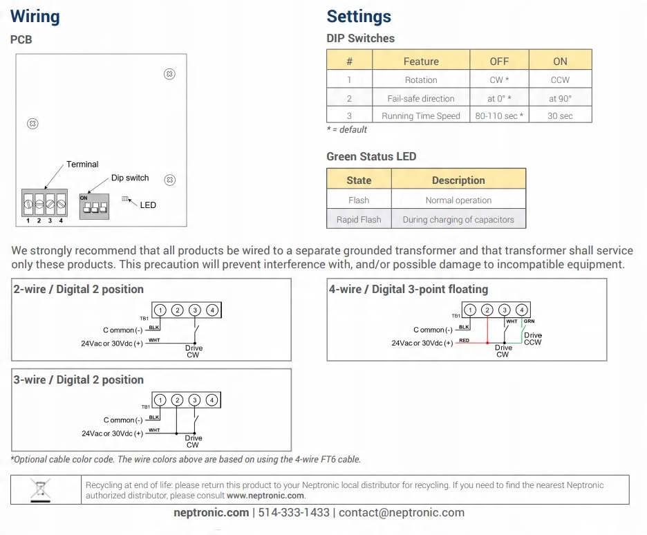 Привід має акумулятор , який у разі напруги в мережі переміщує дросель у первісне положення. (щільно натискає), сама площина дросельної заслінки жорстка (виготовлена з двох шарів зварених точок. Або 2-пк (налаштування за допомогою DipSwitch) може бути живлений і керувати двома проводами або трьома.
