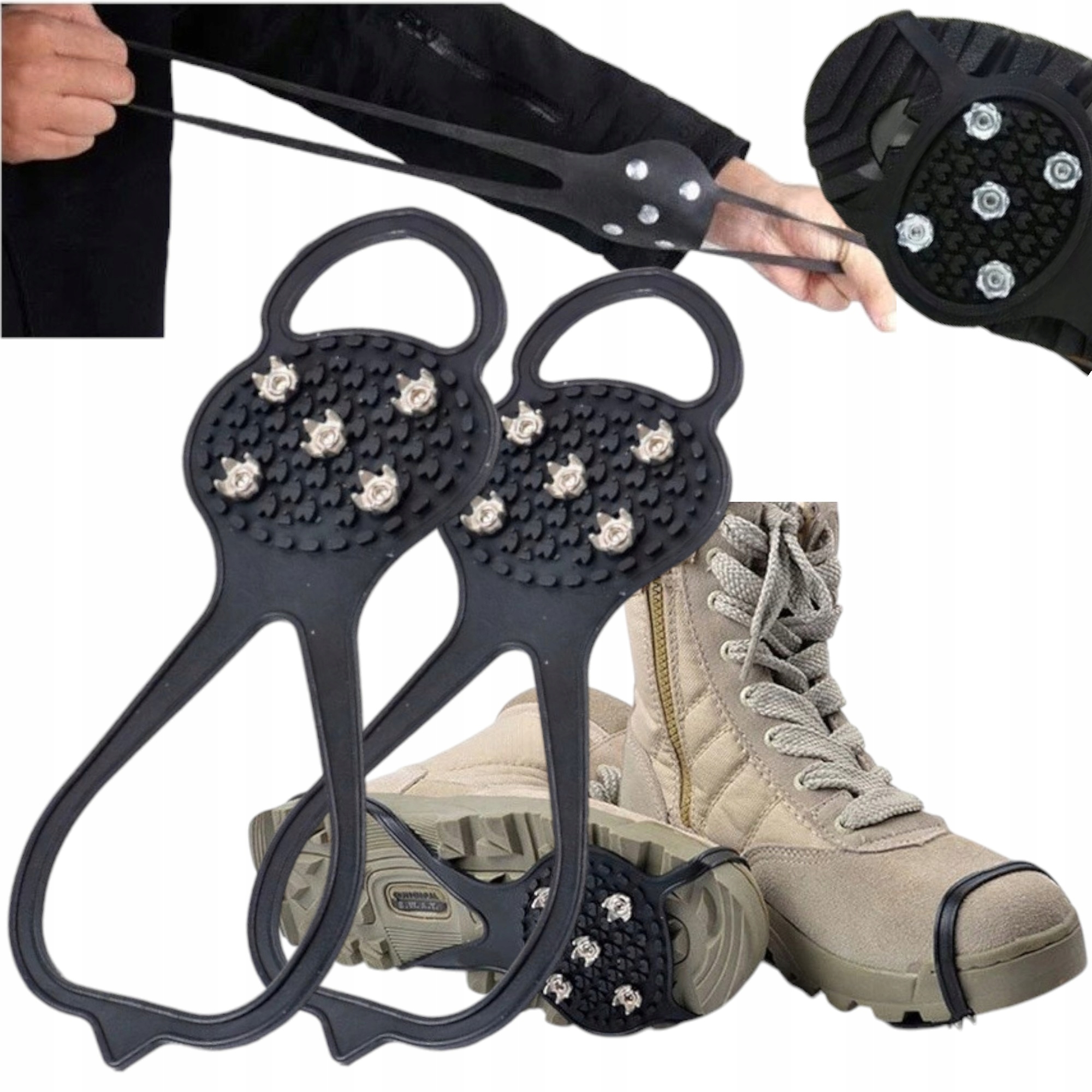 Чахили проти ковзання. Завдяки їм ви зможете легко і швидко підготувати взуття до походу в гори або по крижаній місцевості. Просто натягніть накладки на взуття, і все готово. Виготовлені з міцної еластичної гуми, вони ідеально підходять до форми взуття. Вони також мають металеві шипи для зчеплення.