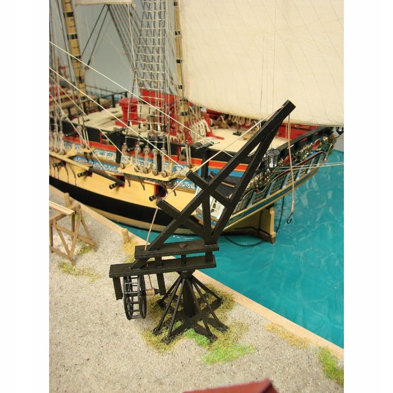 Судноверф і портова пристань - модель Chatham 1780, вирізана лазером, № 38 CAT. НІ ML:038, масштаб 1:72, розміри моделі: висота: 22,5 см, ширина: 46,5 см, довжина: 95,0 см. Модель, вирізана лазером, включає: усі деталі, вирізані лазером, інструкції з виготовлення, блоки та шнурок. Модель для самостійного малювання. Модель не включає: Штучну рослинність, пісок і воду, а також модель корабля "HMS Mercury" з набору лазерної обробки №. 6.