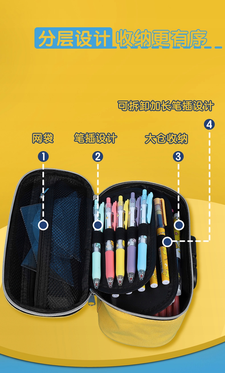 Пенал складається з 1 великого відділення, 2 панелей для ручок, олівців , маркери тощо та 1 сітчасте відділення .