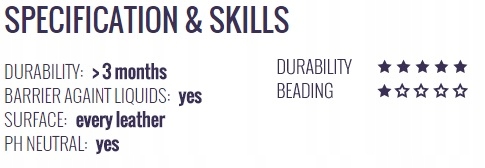 Завдяки довговічності до 3 місяців, це гідрофобне покриття забезпечує захист від рідини, поту, бруду та переносу барвника з джинсів та одягу, що може знебарвити шкіру або залишити плями.