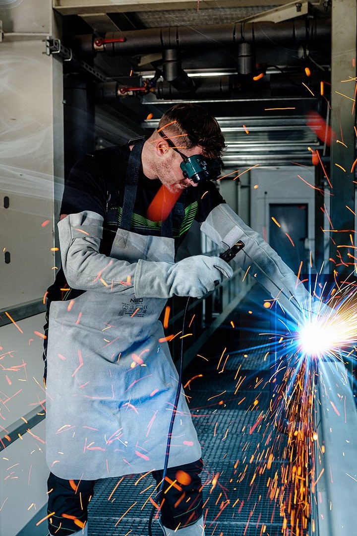 Фартух зварювальний шкіряний 60 х 90 см, смужки бавовна 81-891 фірми NEO являє собою фартух зі спиланої телячої шкіри товщиною 1,2-1,4 мм. Оснащений тканинним ременем на шиї довжиною 75 см і бавовняним поперековим поясом, який регулюється за допомогою липучок, довжина від 55 до 100 см. Обидва ремені кріпляться суцільною кевларовою ниткою. Фартух, розміром 60 х 90 см, відноситься до другої захисної категорії. Сертифіковано його відповідність стандарту EN ISO 11611:2015 і сертифікат CE. Це надзвичайно міцний і надійний робочий одяг NEO, розроблений для зварювальних робіт.